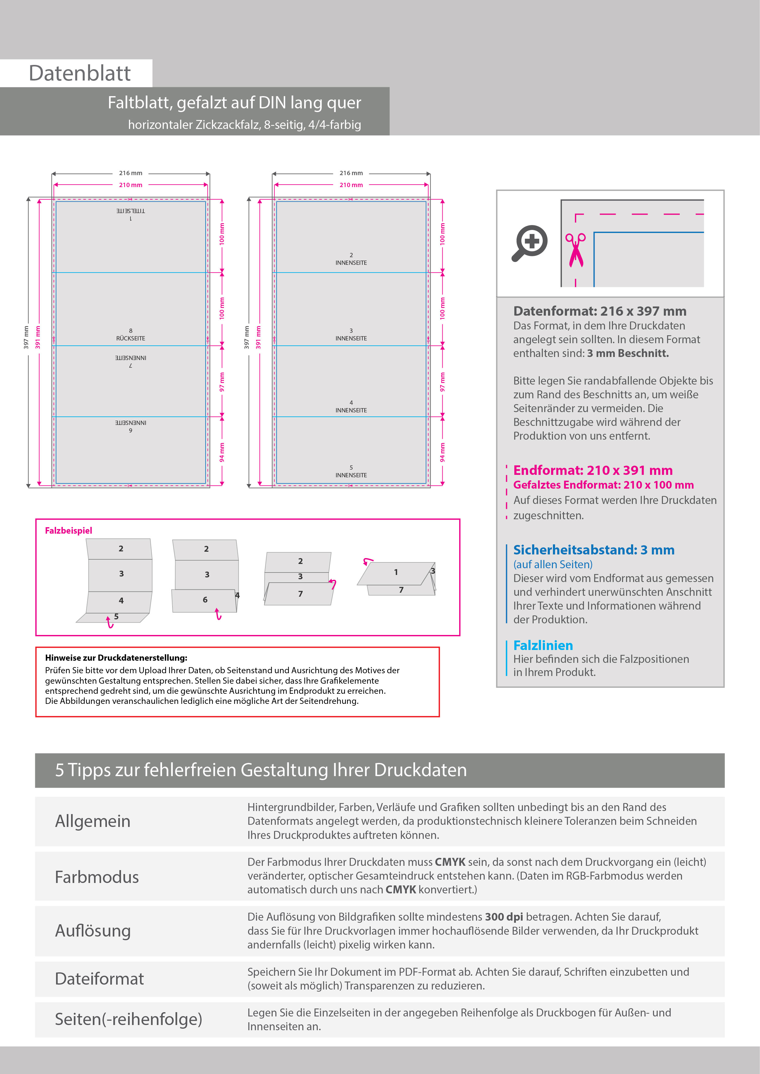 Faltblatt, gefalzt auf DIN lang quer, horizontaler Wickelfalz, 8-seitig